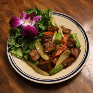 Từng miếng nầm thấm đều sốt mặn ngọt cay nhẹ, ăn kèm ớt chuông, hành tây và rau xanh giúp cân vị, không ngấy. Món ăn dậy mùi thơm hấp dẫn, càng ăn càng cuốn.